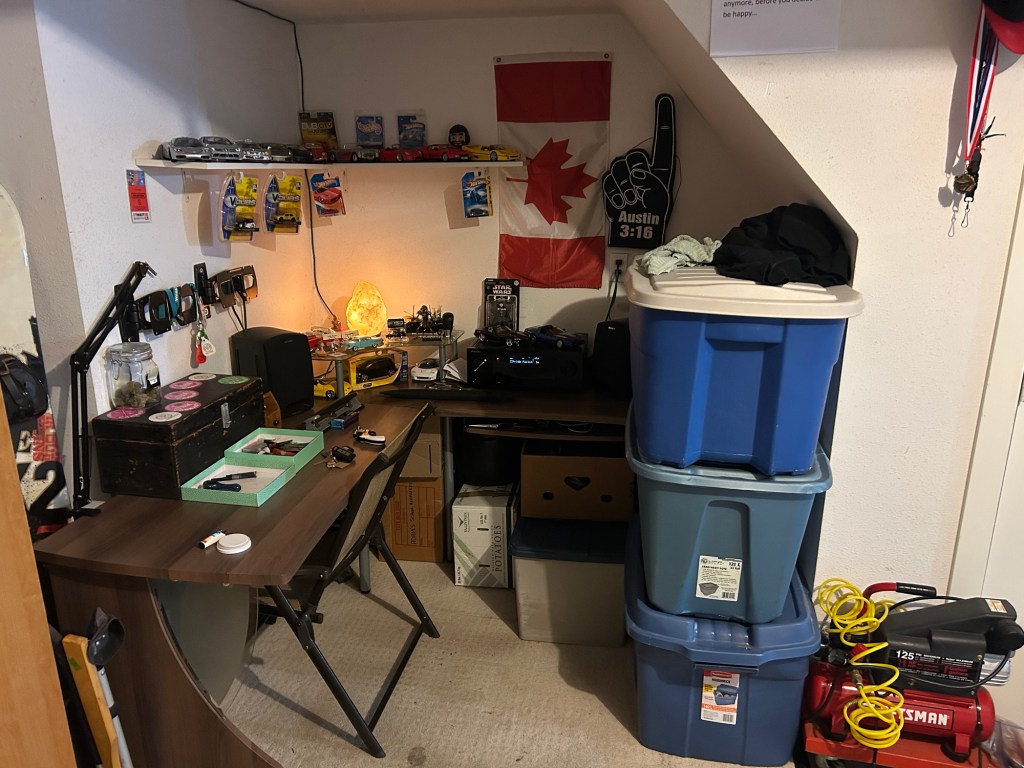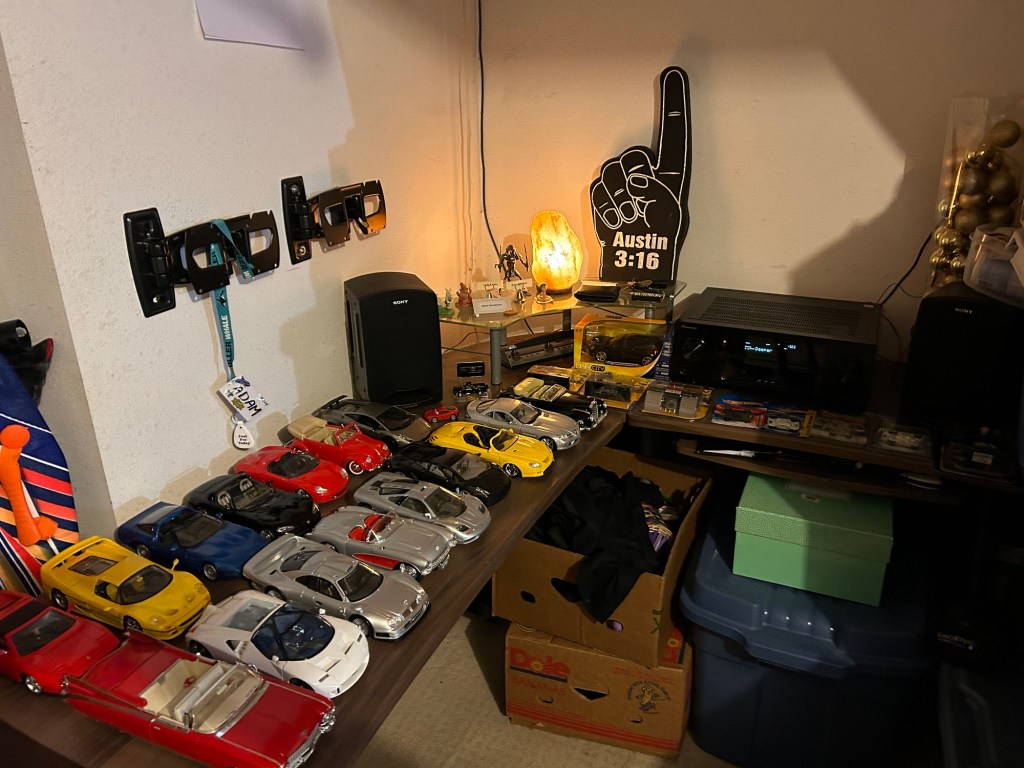 A couple of weeks ago, I got bored of the clutter and decided to make the desk area useable. For what? Who knew? I then went through all of my keepsakes and rediscovered all of my car models, hot wheels, sports memorabilia, sports medals, recovery keepsakes, and school keepsakes. Wow that is a lot when I type that out and realize that my entire childhood memories that I hold near and dear to me are kept in a corner.