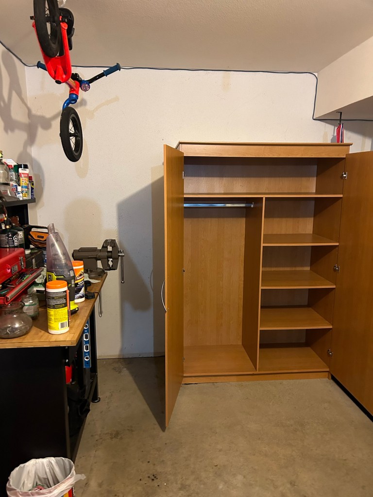 I started filling the cabinet and work bench up with the contents that I had sorted earlier. During the move of the cabinet, the left side door broke off. I thought that it looked better so I left it off. The door would later come into play. I moved all of my weed stuff over to the desk, and called it a day…..